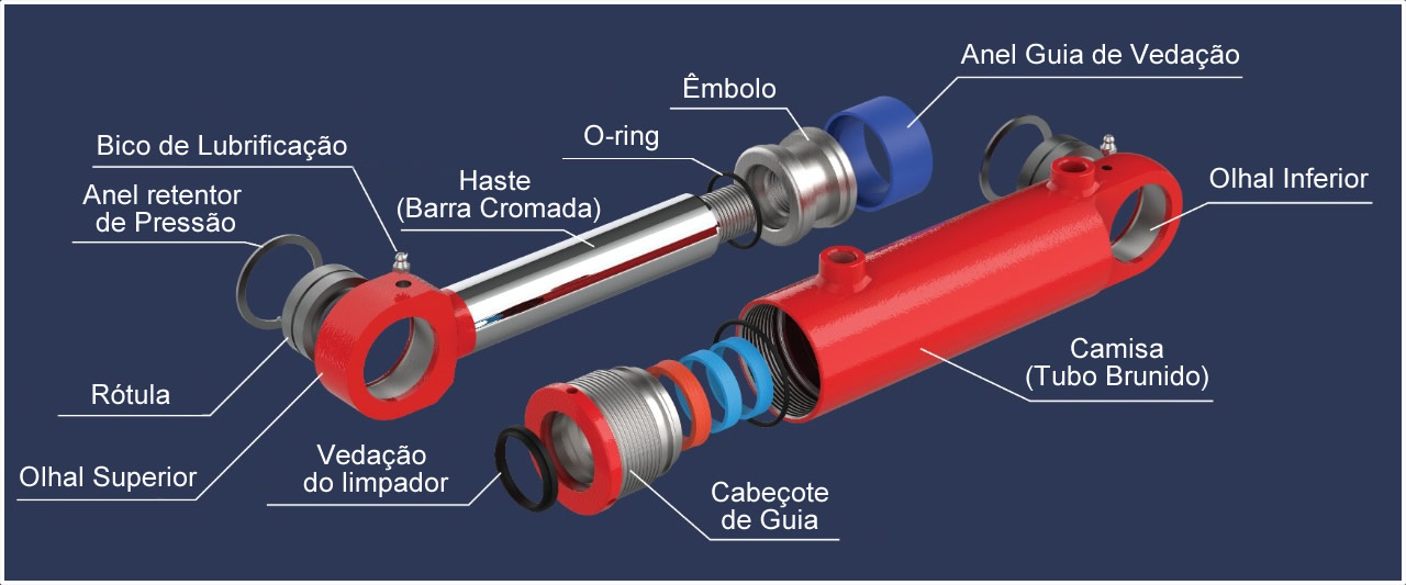 Já no cilindro de dupla ação, há dois pórticos de entrada de óleo, cada um posicionado em um dos lados do êmbolo. A pressão pode atuar em qualquer um desses pórticos, permitindo força hidráulica em qualquer um dos lados, para que ocorra avanço e retorno de acordo com o sentido determinado.