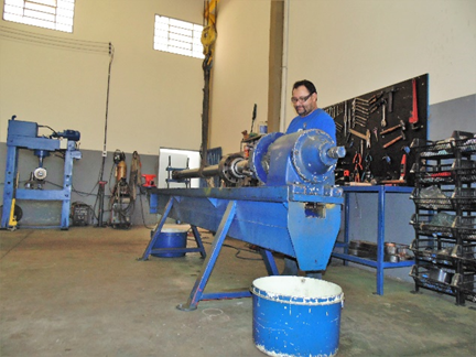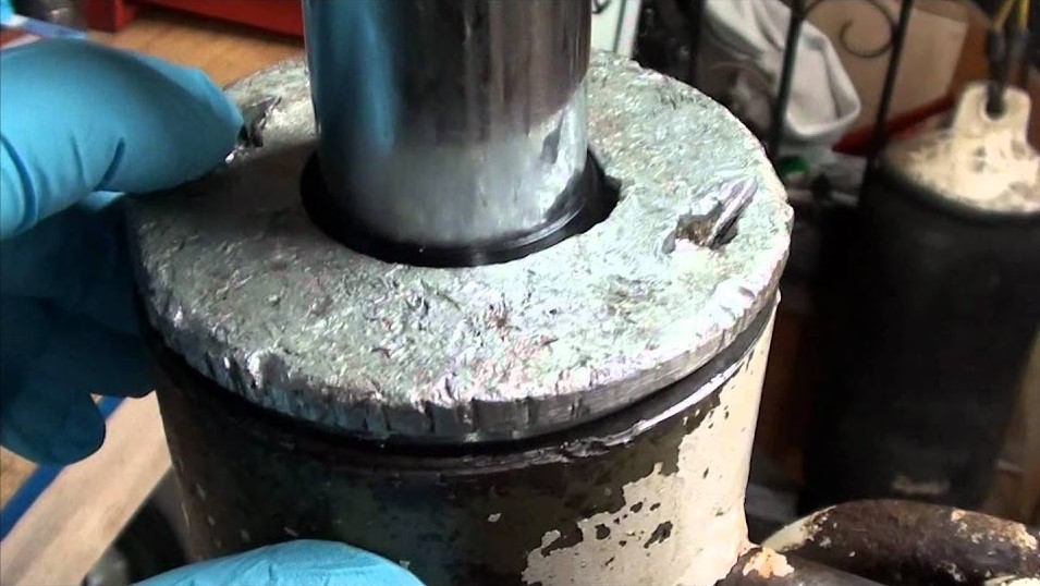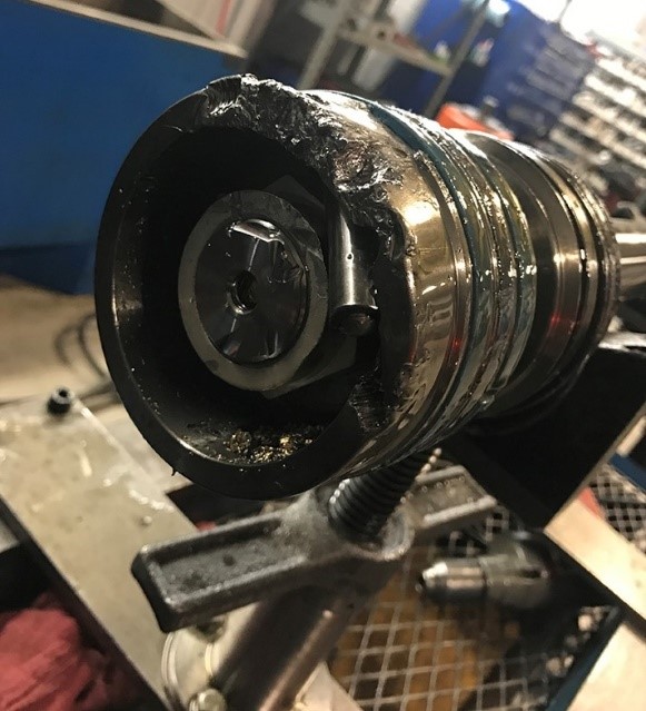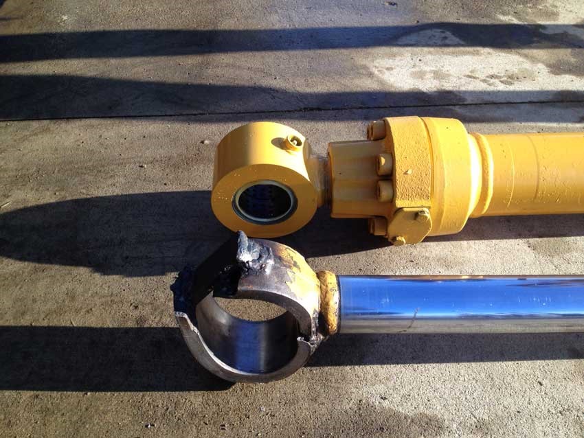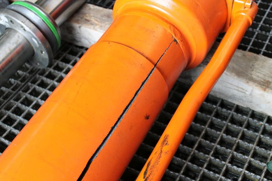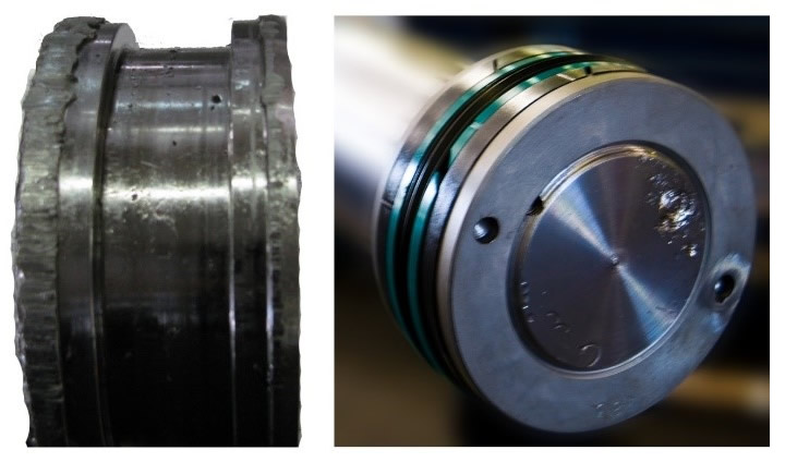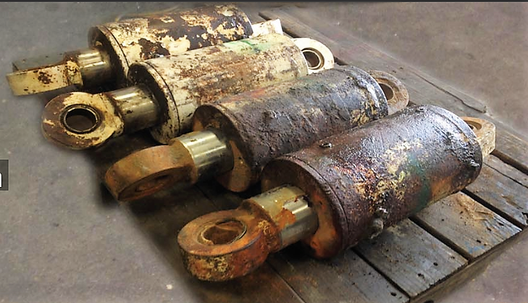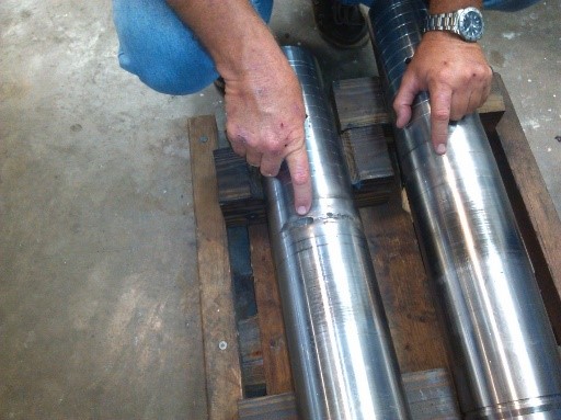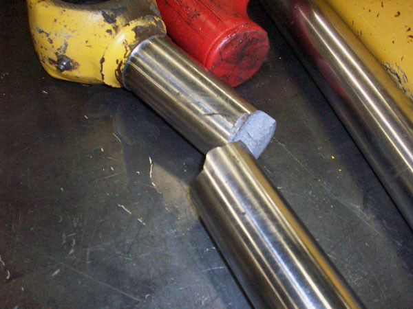 Nesta situação se faz necessária a operação de brunimento, ou dependendo da profundidade dos riscos e imperfeições pode ser preciso fabricar outra camisa. . O êmbolo já está amassado na hora da desmontagem, como mostrado na foto abaixo : Nesta situação se faz necessário a fabricação de um novo êmbolo e a troca das vedações. . Haste danificada (Riscos e Desgastes) conforme foto abaixo : Quando a fissuras e marcas de desgates nas hastes isto pode danificar a vedação dos componentes internos, ocasionando vazamento e consequentemente baixa vida útil de seu equipamento. Caso isso ocorra, o cilindro deverá ser desmontado e a haste deverá ter a camada de cromo removida, uma nova camada de cromo deverá ser reposta e suas vedações substituídas.