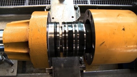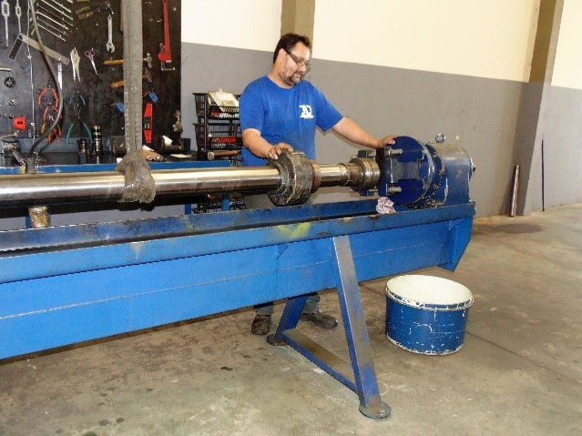 Após esta perícia preliminar procede-se a desmontagem, mais antes os cilindros hidráulicos passam por uma lavagem para desengordurar os mesmos. Desmontagem Para continuar a perícia complementar procede-se a desmontagem dos cilindros hidráulicos da seguinte forma: . Coloca-se o cilindro hidráulico na bancada / torquímetro e procede-se a desmontagem conforme fotos abaixo: