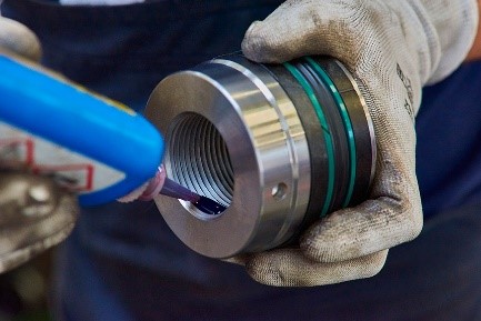 . Se necessário, remove-se o dispositivo de bloqueio entre o olhal do cilindro e a haste e usa-se uma chave de boca na região “pega-chave”. Colocase uma cinta de içamento em torno do olhal do cilindro de modo que ele seja pego ao soltar da haste. Em seguida girasse a haste usando a chave até que o olhal do cilindro solte da haste. . Aperta-se as cintas de içamento no cabeçote do cilindro e o empurrasse lentamente para fora da haste (se estiver difícil para empurrar o cabeçote do cilindro na haste, devemos girar a haste lentamente). . Remove-se as vedações e limpasse o cabeçote do cilindro com cuidado usando um agente de lubrificação (dos resíduos de cola antigos, partículas de poeira, etc.). Também limpasse a haste cuidadosamente, pois qualquer partícula de sujeira pode danificar a vedação durante a montagem. Não pode-se esquecer de limpar a rosca da haste, olhais do cilindro e a tampa de proteção.