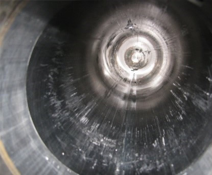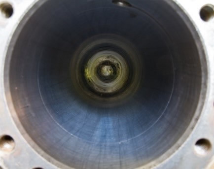 Se a folga diametral entre camisa e êmbolo estiver dentro do padrão aceitável pela vedação a ser utilizada, ainda é possível fazer o brunimento. Isto é verificado fazendo a medição do diâmetro interno da camisa com o SÚBITO (comparador de diâmetro interno) e a medição do diâmetro externo do êmbolo com o MICRÔMETRO. Agora se a folga diametral entre camisa e êmbolo estiver fora do padrão aceitável pela vedação a ser utilizada, podemos resolver esse problema das seguintes maneiras: - Fabricação de uma nova camisa (a ser brunida também) - Fabricação de um novo êmbolo ( vedações devem ser substituídas) . Uma outra situação que pode ser verificada já de pronto a desmontagem, é que a camisa está trincada ou riscada ou tem pouca rugosidade, e os sulcos hachurados na forma de um X tem pouca profundidade, e não conseguem reter uma película de lubrificante para diminuir o atrito entre camisa e êmbolo, como é mostrado na foto abaixo: